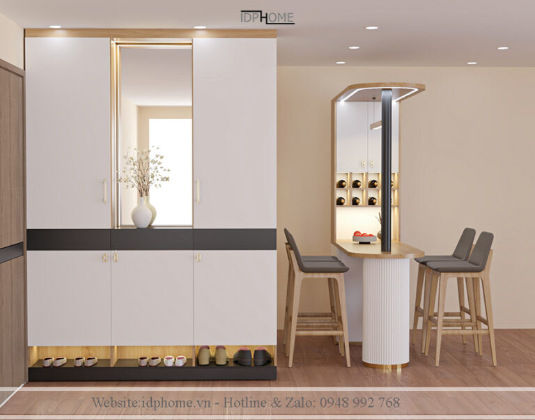 Một điểm độc đáo trong hình ảnh mẫu là sự kết nối giữa mẫu tủ giày kịch trần đẹp và hệ quầy bar/bàn đảo nhỏ bên cạnh.
