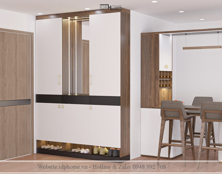 Vách ngăn không gian: Hệ tủ đóng vai trò như một bức vách ngăn hờ giữa cửa chính và phòng khách/bếp, đảm bảo yếu tố phong thủy.