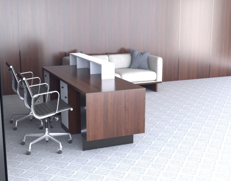 Mẫu quầy lễ tân có thể thay đổi kích thước để phù hợp với các sảnh vừa và lớn. Mặt sau quầy được chia làm nhiều khoang tiện dụng, dễ dàng lưu trữ hồ sơ, máy in, máy tính, điện thoại nội bộ và các vật dụng cần thiết khác cho nhân viên lễ tân.