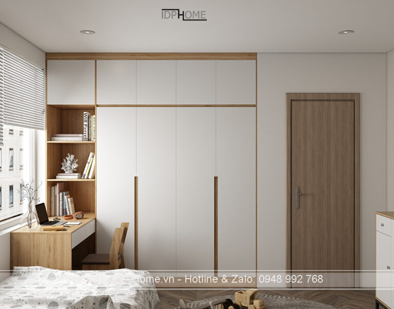 Tủ quần áo kết hợp với bàn học đang là sự lựa chọn tối ưu nhất đối với những phòng ngủ nhỏ, thường là chung cư, nhà ống. Với mẫu tủ quần áo thông minh này sẽ giúp căn phòng của bạn tiết kiệm diện tích, vừa tăng tính thẩm mỹ, tạo nên sự đồng bộ, hài hòa cho căn phòng. Tủ quần áo được thiết kế sát với trần nhà là một lợi thế để có thêm diện tích chứa đồ. Tủ được chia ô đa năng với nhiều kích thước to nhỏ khác nhau giúp bé lưu trữ đồ theo phân loại rất tiện dụng.