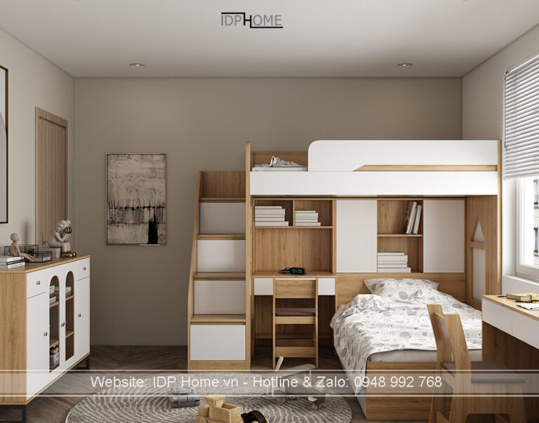 Thiết kế phòng ngủ cho 2 bé trai PB6814 gồm có: giường tầng thông minh, một tủ quần áo kết hợp bàn học đa năng và một tủ đồ nhỏ gọn.