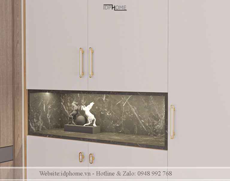 Hốc trang trí đèn LED: Điểm nhấn bằng Melamin giả đá đen huyền bí kết hợp ánh sáng vàng, là nơi lý tưởng để trưng bày túi xách hoặc các vật phẩm decor.
