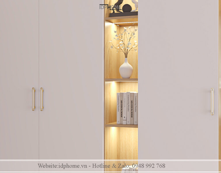 Điểm nhấn đắt giá nhất của mẫu tủ giày kịch trần này chính là khoang cánh hở được bố trí ngay chính giữa. Với hệ thống đèn LED âm tủ hiện đại, đây là nơi lý tưởng để trưng bày những cuốn sách yêu thích, đồ decor hay những món đồ lưu niệm giá trị. Thiết kế này giúp phá vỡ sự đơn điệu của các cánh tủ kín, tạo độ “thở” và sự thanh thoát cho tổng thể sản phẩm.